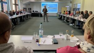 Nach dem Zimmerbezug, etwas Smalltalk im Foyer und einem gelungenen Abendessen gab es vom Gründungsmitglied Peter Jurmeister einen Rückblick wie alles begann. Interessiert lauschten alle Anwesenden den Schilderungen, wie aus der Frauenselbsthilfe die Ausgliederung und Verselbstständigung der Männerbewegung hervorging. Der Vortrag war gespickt mit Anekdoten der Zeit. Auch hat Peter aufgezeigt, mit welchen Schwierigkeiten der Prozess behaftet war und welche Lösungen zu den Themen gefunden wurden. Zusammenfassend endete der Vortrag mit dem Statement in einem Verein mit stabilen Strukturen, engagierten Mitgliedern, gesicherter Finanzierung und herausfordernden Aufgaben zu sein.