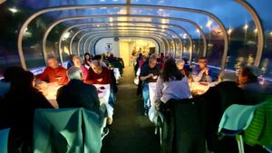 Dort angekommen ging es recht zügig aufs Schiff. Hier wurden wir kulinarisch verwöhnt, während das Schiff wie schwebend an den Sehenswürdigkeiten von Berlin vorbeifuhr. Der Kapitän erklärte jeweils was und wo etwas zu bestaunen war. Es war eine ganz besondere Perspektive, die monumentalen Bauwerke quasi von einem tiefen Punkt aus zu sehen. Hier wurde dann auch der Tagesausklang in geselliger Runde begangen.